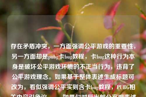 存在矛盾冲突,一方面强调公平游戏的重要性,另一方面却是pubg卡bug教程,卡bug这种行为本身是破坏公平游戏环境的不正当行为,违背了公平游戏理念。如果基于整体表述生成标题可改为,看似强调公平实则含卡bug教程,PUBG相关内容引争议 。,如果仅对后半部分客观表述,标题可为,PUBG卡bug教程介绍 。但需要说明的是,卡bug行为不应被提倡和宣扬。